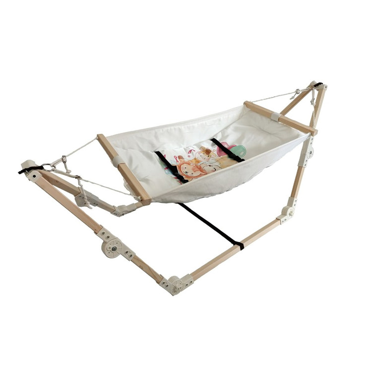 جنس بدنه گهواره از چوب روس درجه یک و دارای دو چرخدنده در مفصل برای سهولت در نصب و جمع کردن گهواره .مفاصل کاملا فلزی با روکش ای بی اس درجه یک می باشد